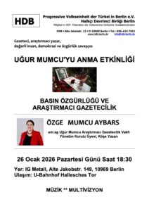 HDB Berlin’in anma programına, Uğur Mumcu’nun düşünsel mirasını yaşatmak ve gazetecilik anlayışını yeni kuşaklara aktarmak amacıyla 1996 yılında kurulan Uğur Mumcu Araştırmacı Gazetecilik Vakfı’nın (um:ag) Yönetim Kurulu Üyesi ve köşe yazarı Özge Mumcu Aybars konuşmacı olarak katılacak. Etkinlik, 26 Ocak 2026 Pazartesi günü saat 18.30’da, Alte Jakobstraße 149, 10969 Berlin adresindeki IG Metall (Metall İşçileri Sendikası) binasında gerçekleştirilecek.