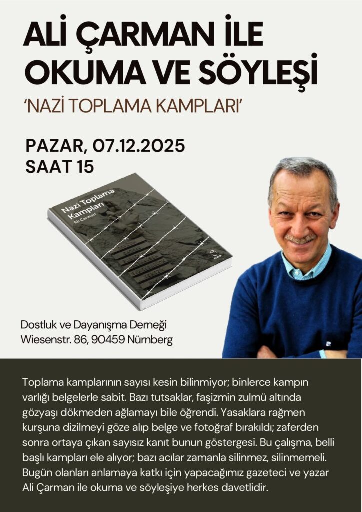 Gazeteci ve yazar Ali Çarman, 7 Aralık 2025 pazar günü Nürnberg’de “Nazi Toplama Kampları” adlı kitabı üzerine bir okuma ve söyleşi gerçekleştirecek. Etkinlik saat 15.00’te Dostluk ve Dayanışma Derneğinin (Wiesenstraße 86, 90459 Nürnberg) ev sahipliğinde yapılacak.