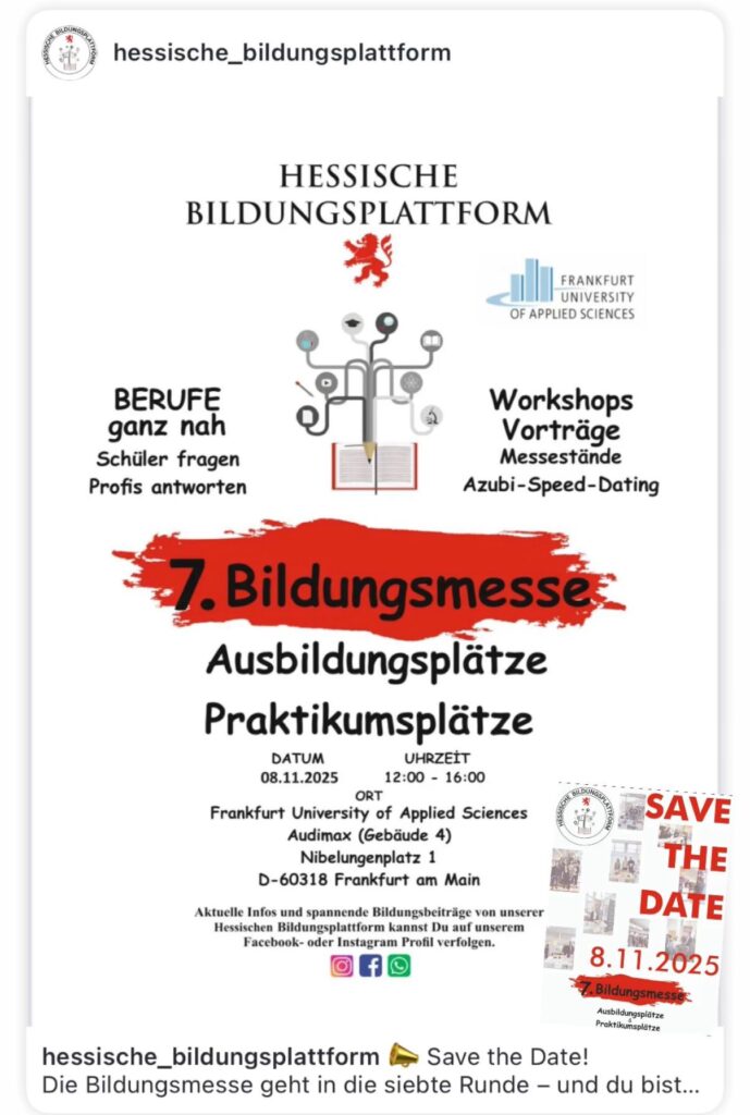 Frankfurt Uygulamalı Bilimler Üniversitesi’nin (Frankfurt UAS – Frankfurt University of Applied Sciences, eski adıyla Frankfurt Yüksekokulu) kent merkezindeki kampüsünde 8 Kasım cumartesi günü saat 12.00’den itibaren gerçekleştirilecek fuara, daha önceki yıllarda olduğu gibi RheinMain bölgesi ve çevresindeki kentlerden öğretim ve mesleki eğitim kurumları ile meslek eğitimi ya da yükseköğrenim desteği veren kamusal kuruluşlar ve özel şirketler, kendi personellerinin yer aldığı bilgilendirme stantlarıyla katılacak.