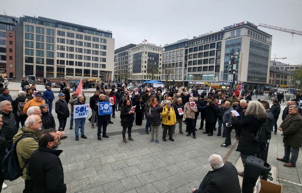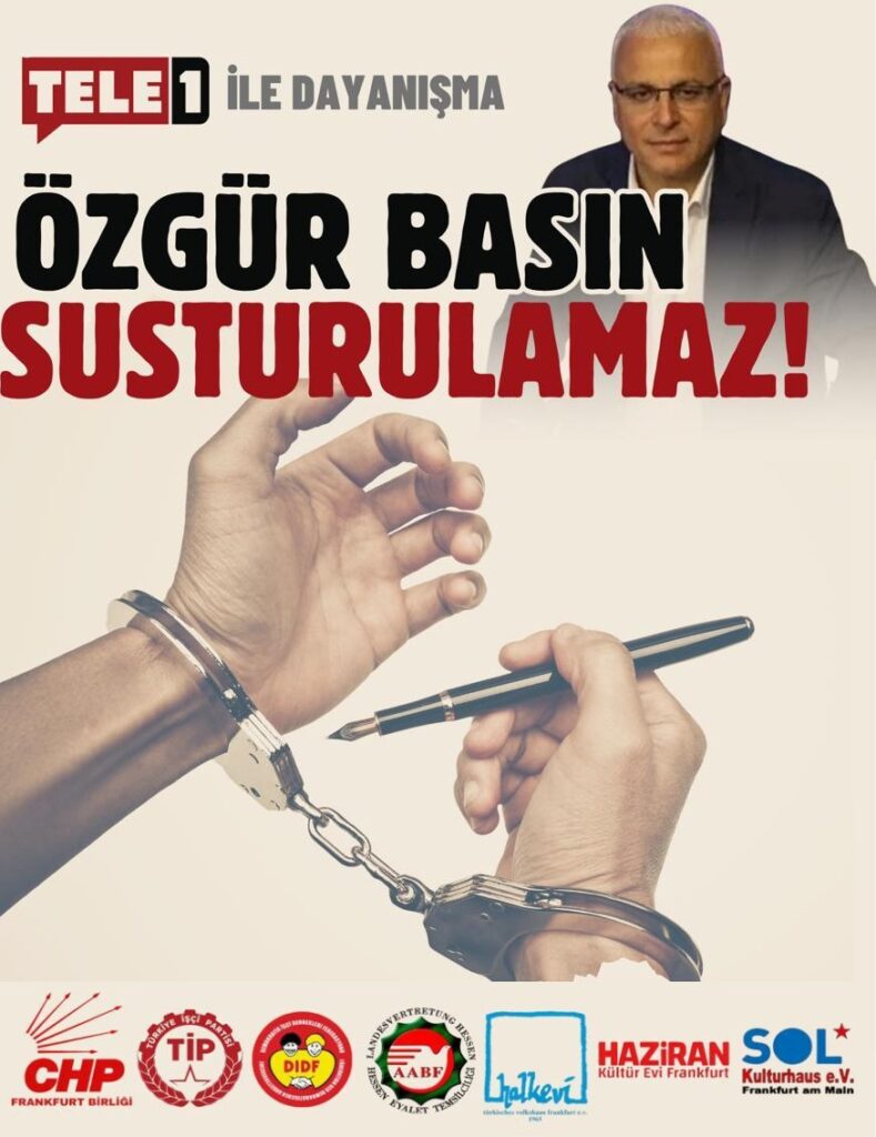 TELE1’e kayyım atanması ve kanalın kurucusu Merdan Yanardağ’ın casusluk suçlamasıyla tutuklanmasına karşı yapılan protesto, Frankfurt kent merkezinde gerçekleştirildi. Türkiye’deki basın ve ifade özgürlüğü ihlallerine tepki amacıyla düzenlenen eyleme, Almanya Sosyal Demokrat Partisi (SPD) ile birlikte çok sayıda sosyal demokrat ve sosyalist örgüt destek verdi.