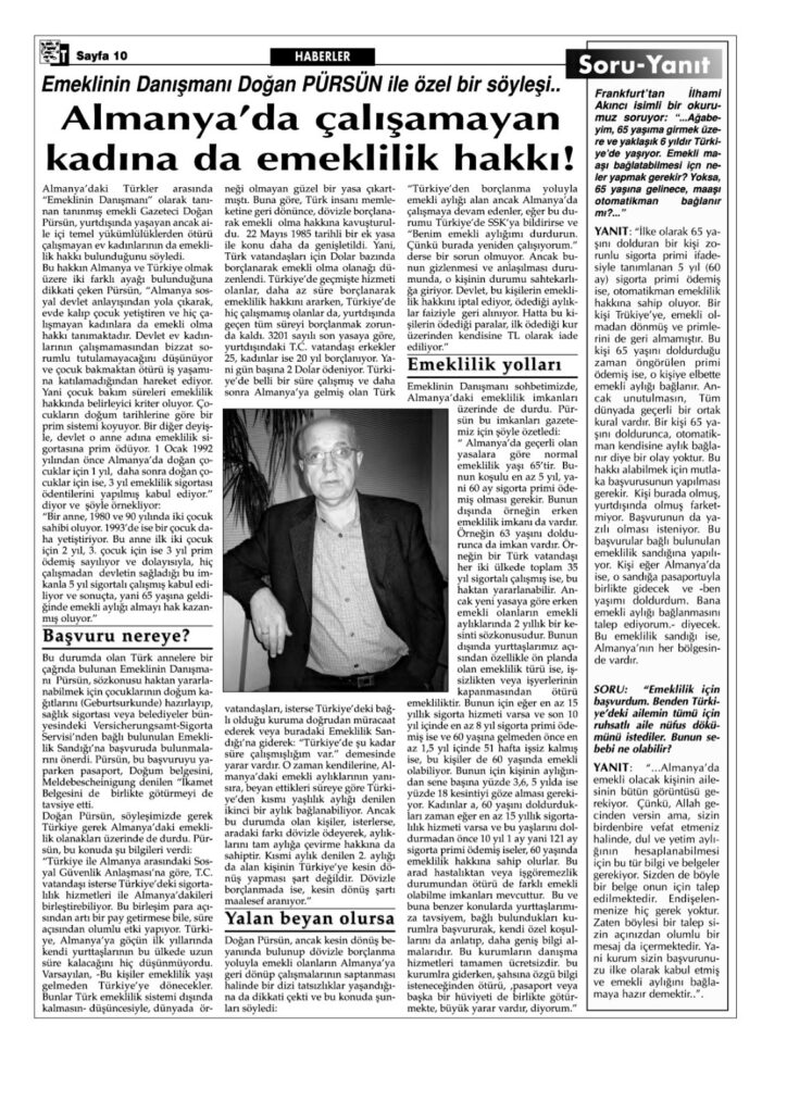 Pürsün’ün yıllar içinde genişleyen konuları arasında “Almanya’da nasıl emekli olunur?”, “İşyeri Emekli Sandığı hangi hakları sağlar?”, “Ev kadını hiç çalışmadan nasıl emekli olabilir?”, “Yurtdışı borçlanması nasıl yapılır?”, “Borçlanma SGK mı BAĞ-KUR mu sağlar?” gibi pek çok başlık yer aldı.