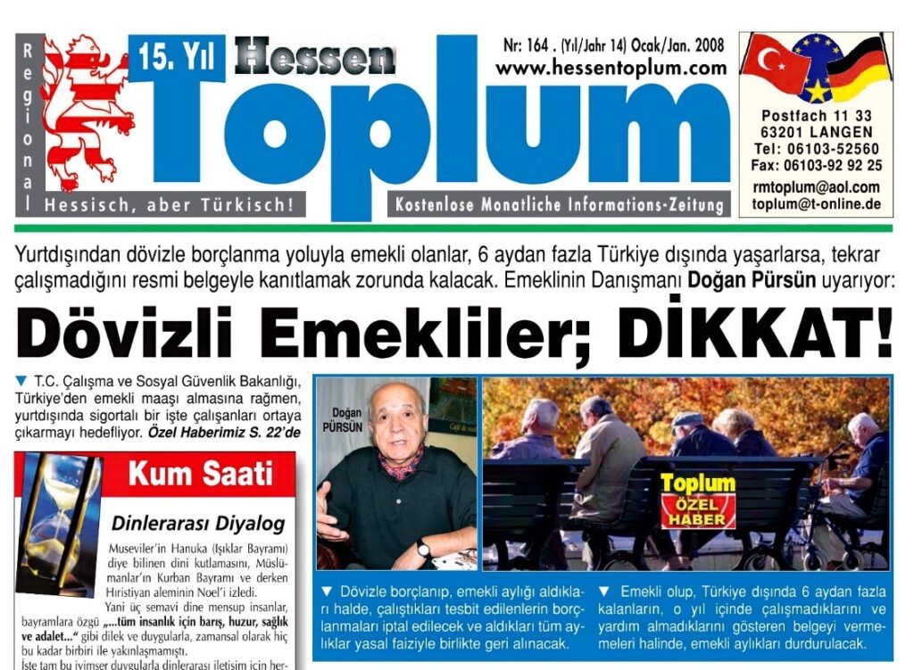 “Doğan Pürsün, Hessen Toplum’da ‘Emeklinin Danışmanı’ydı. Almanya’da Türkler arasında bu unvanla tanındı. 2006 yılında, gazetemizin imtiyaz sahibi merhum Mehmet Canbolat’ın kendisiyle yaptığı ‘Almanya’da çalışmayan kadına da emeklilik hakkı’ konulu özel söyleşiden sonra, Hessen Toplum’da düzenli olarak yazmaya başladı. 2007’de yayımlanan ilk yazısından 2024 yılına kadar, okuyucularımızdan gelen soruları emeklilik uzmanı gözüyle yanıtladı.”