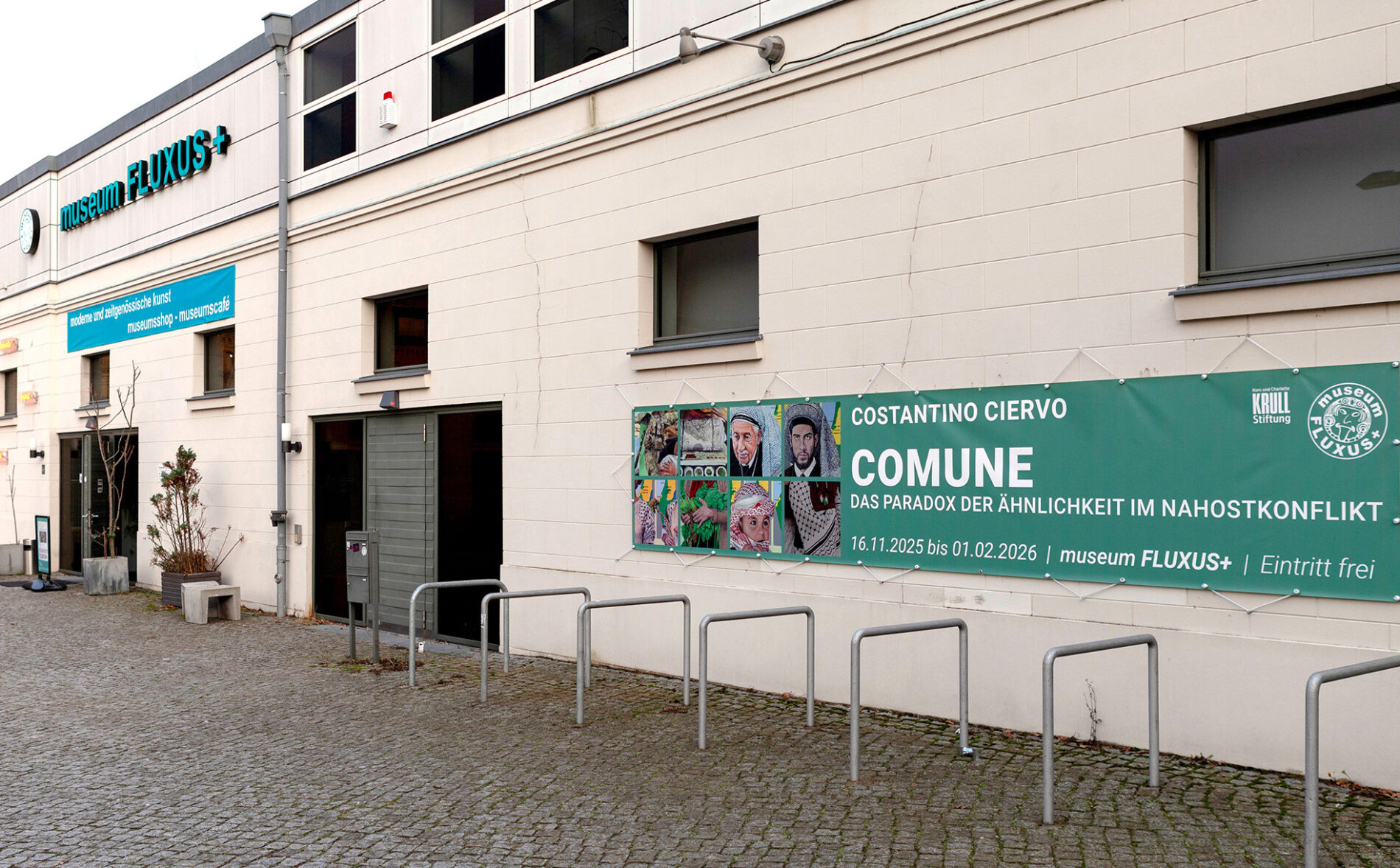 1 Şubat 2026’ya kadar sürecek sergide, yapay zeka kullanılarak haritaların önünde duran Filistinli şahsiyetlerin portreleri görsel “ikizlere” dönüştürülüyor, böylelikle her ikisinin de aslında aynı kaderi paylaştıkları vurgulanmış oluyor. Aynı kişiler, aralarında Davut’un Yıldızı da olmak üzere çeşitli sembollerle tasvir ediliyor…